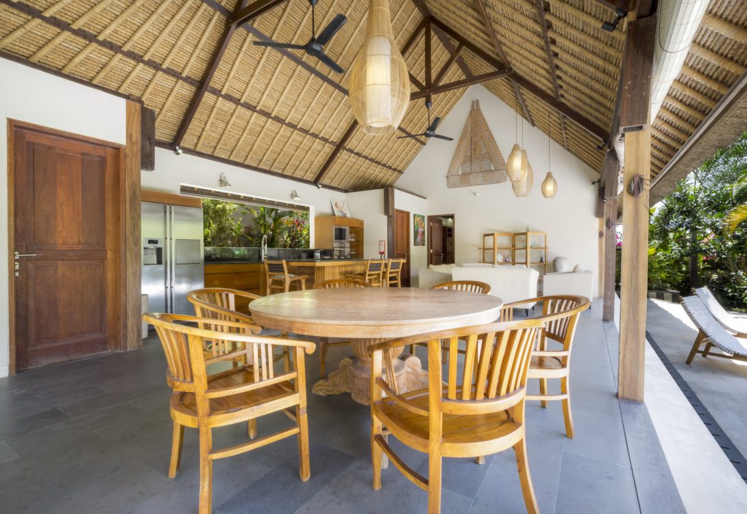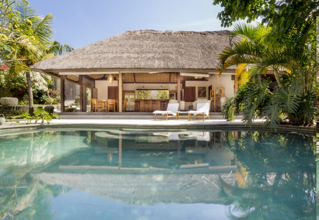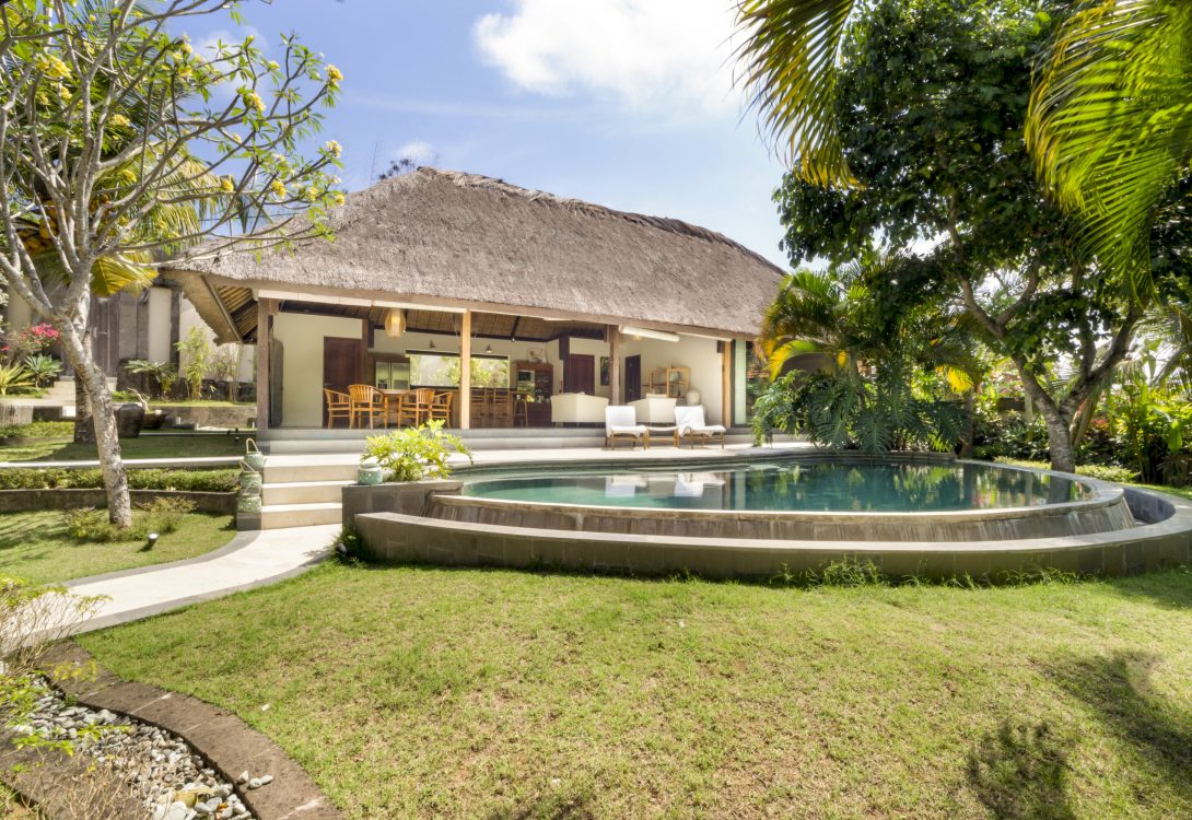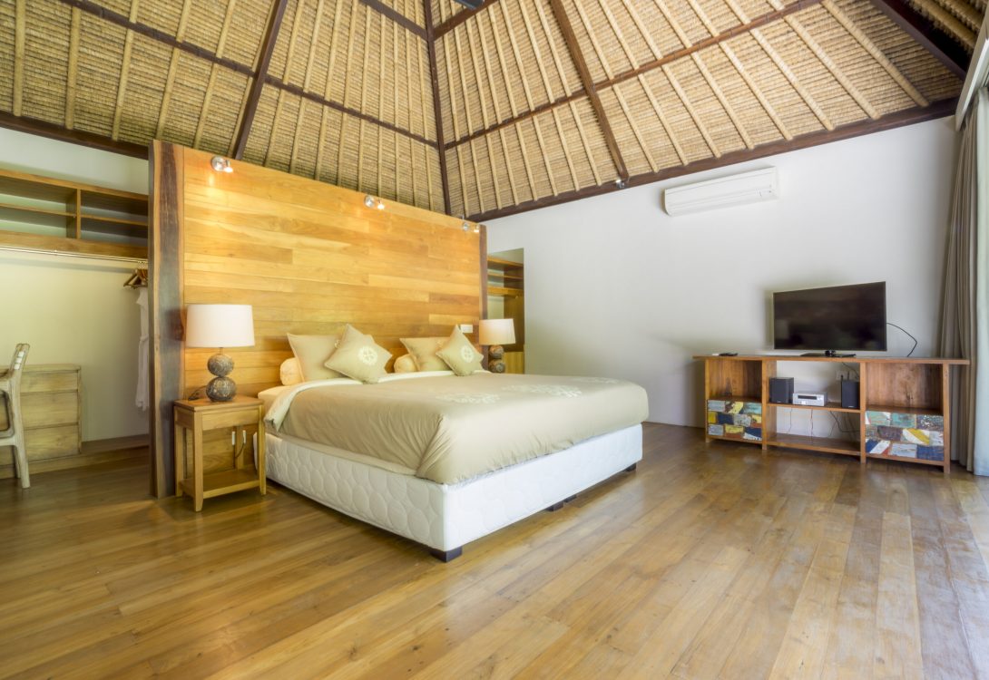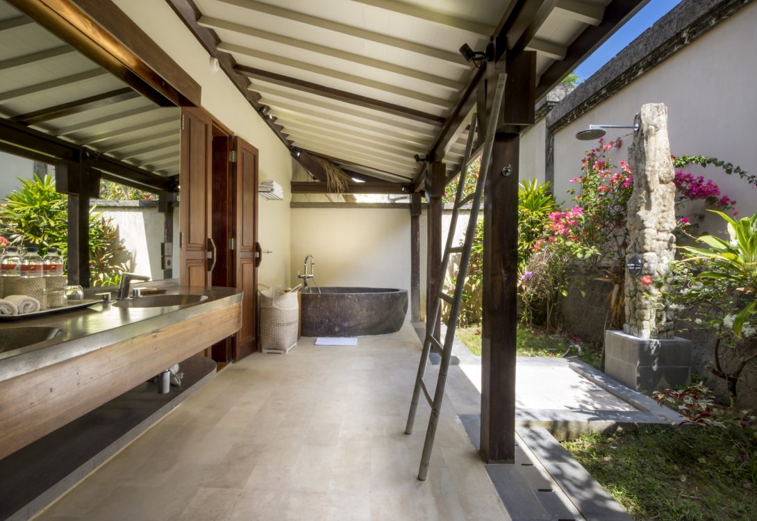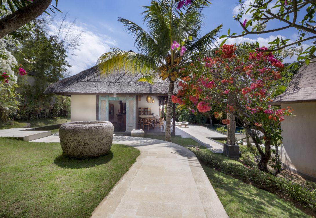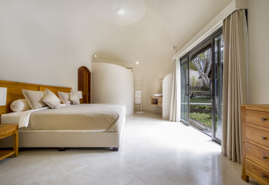 A stylish 2-bedroom villa featuring unique cashew-shaped pools and elegant curves inspired by Javanese design. Enter through an antique carved door into the open-plan living area with a kitchen and island bar. The master suite offers garden views, a walk-in wardrobe, and a luxurious semi-outdoor bath. In the garden, a chic curved bungalow features a snail-shaped bathroom — a dream for architecture lovers seeking comfort, privacy, and tropical charm.