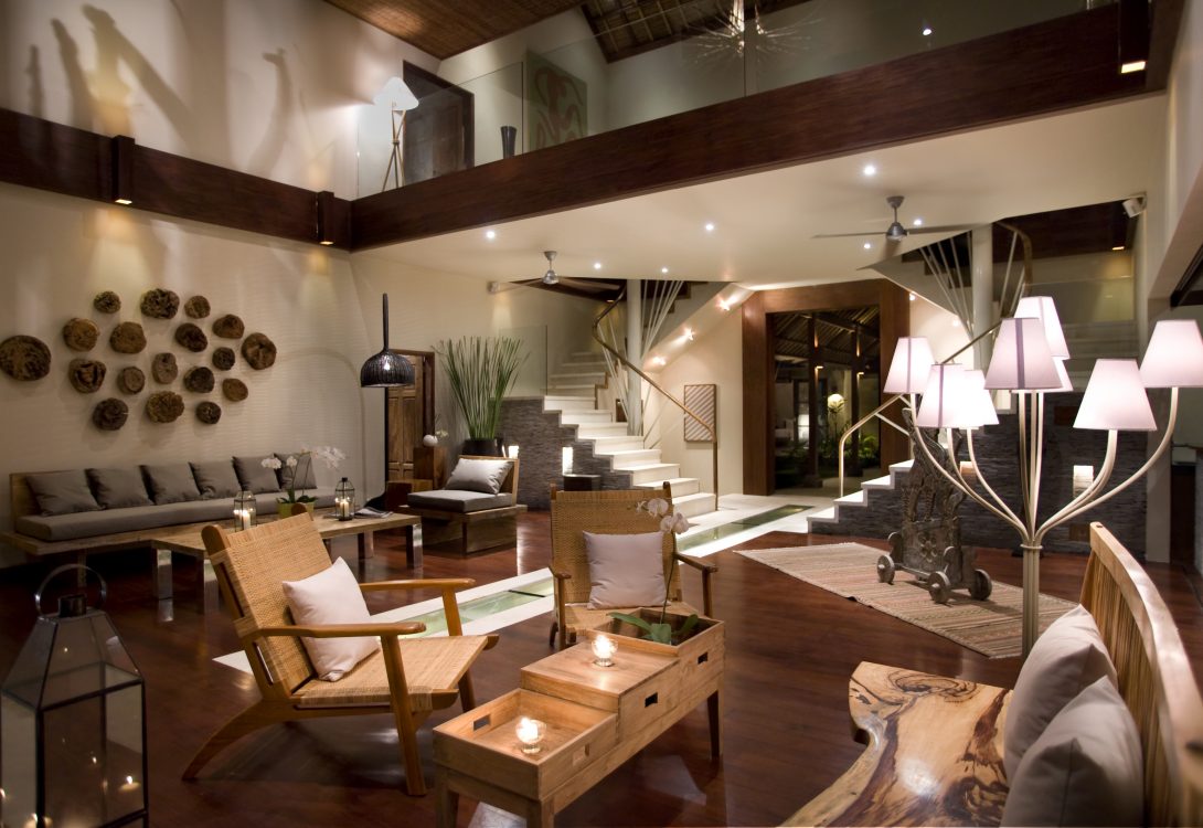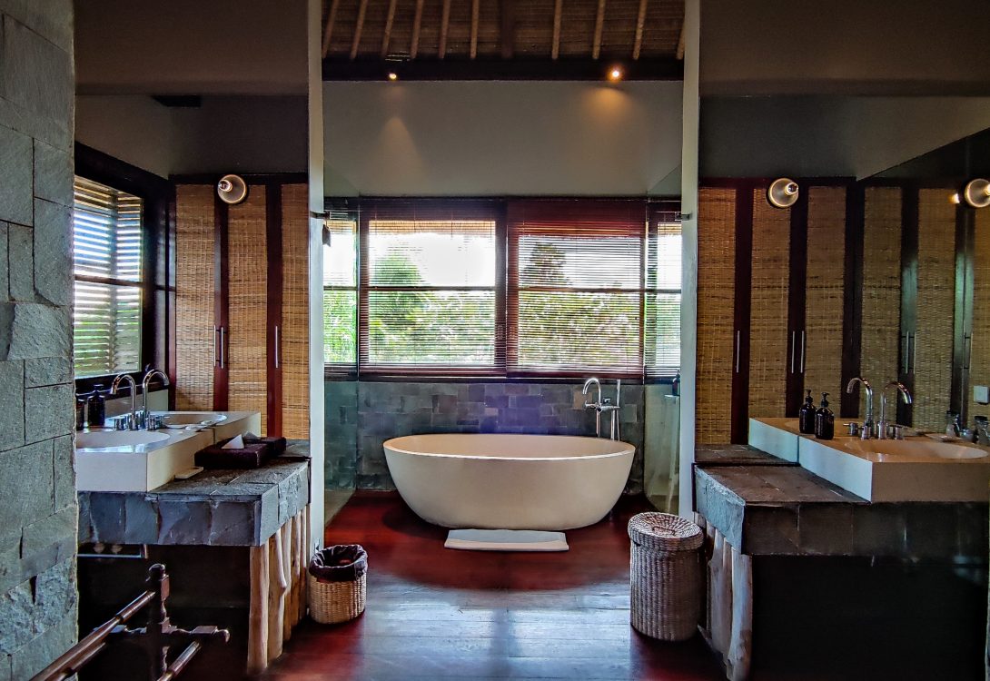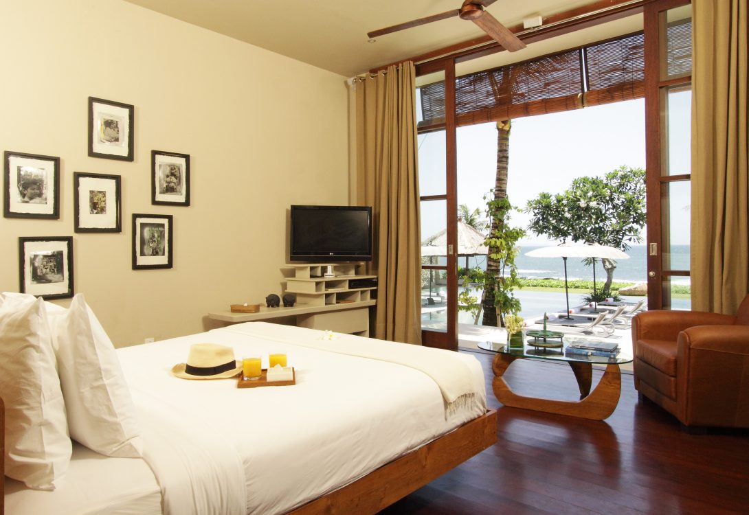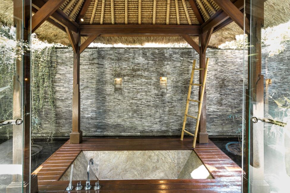 The villa’s façade is marked by four towering wooden columns with retractable screens. Outside, a 20 by 6 meter T-shaped infinity pool overlooks a lawn that slopes to the beach where a relaxation balé and dining pavilion with ocean views await.
