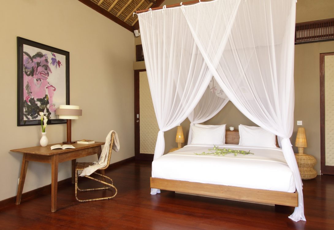 Approached by a grand colonnaded walkway with a soaring thatched roof, this elegant five-bedroom villa offers stunning sea views from three rooms. Two bedrooms, one twin and one queen, open onto semi-private gardens with fishponds.