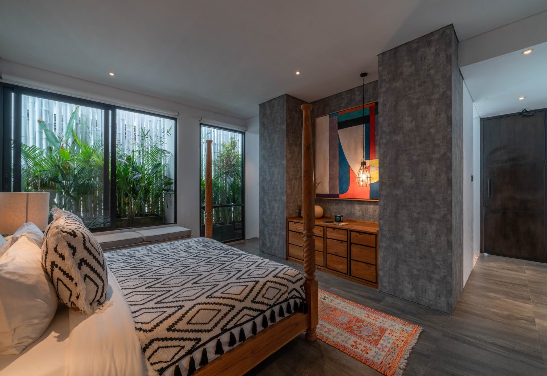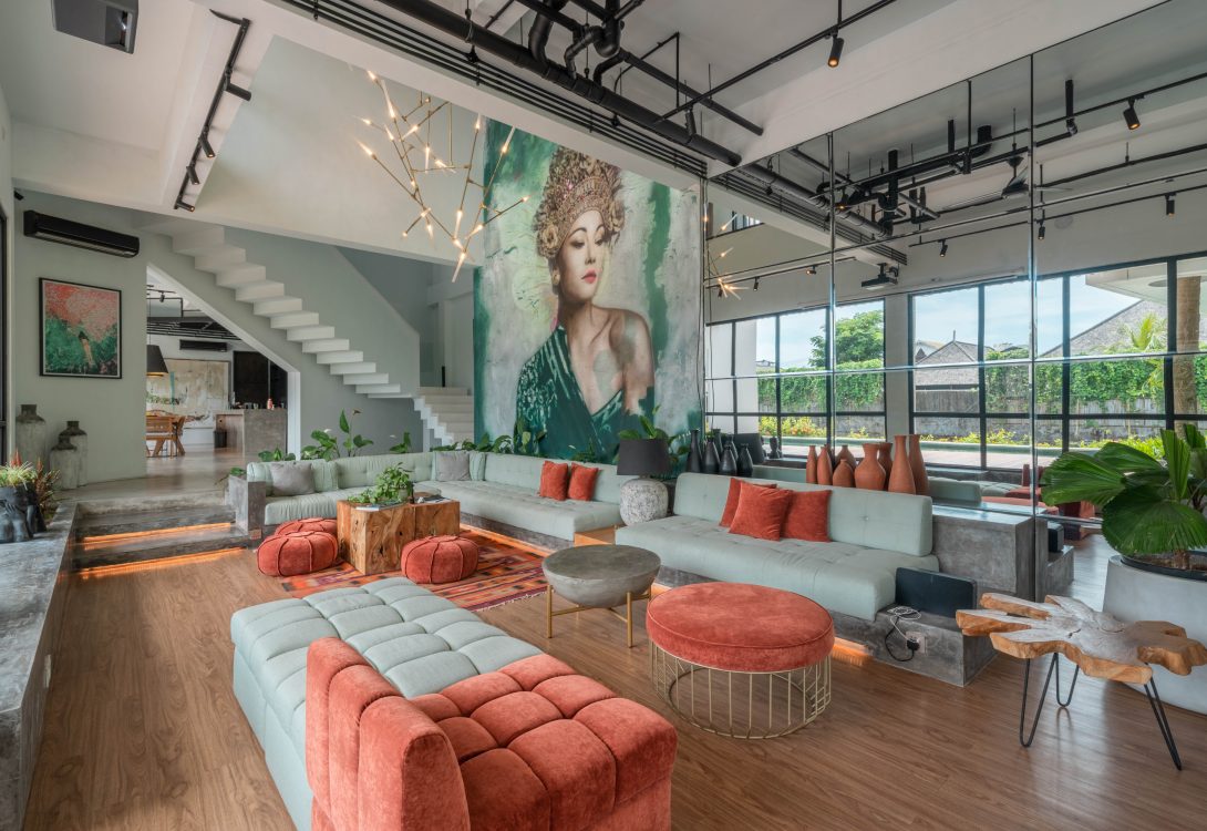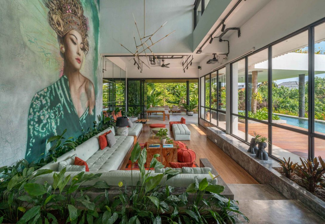 Every corner is designed to impress — from the dramatic staircase wrapped around a floating Frangipani tree, to art-filled walls featuring murals by local Bali artists, and a Brutalist-inspired entrance that leads to the serene guest suites. Thoughtfully curated lighting by Studio Nimmersatt sets the perfect mood across every space, both day and night.