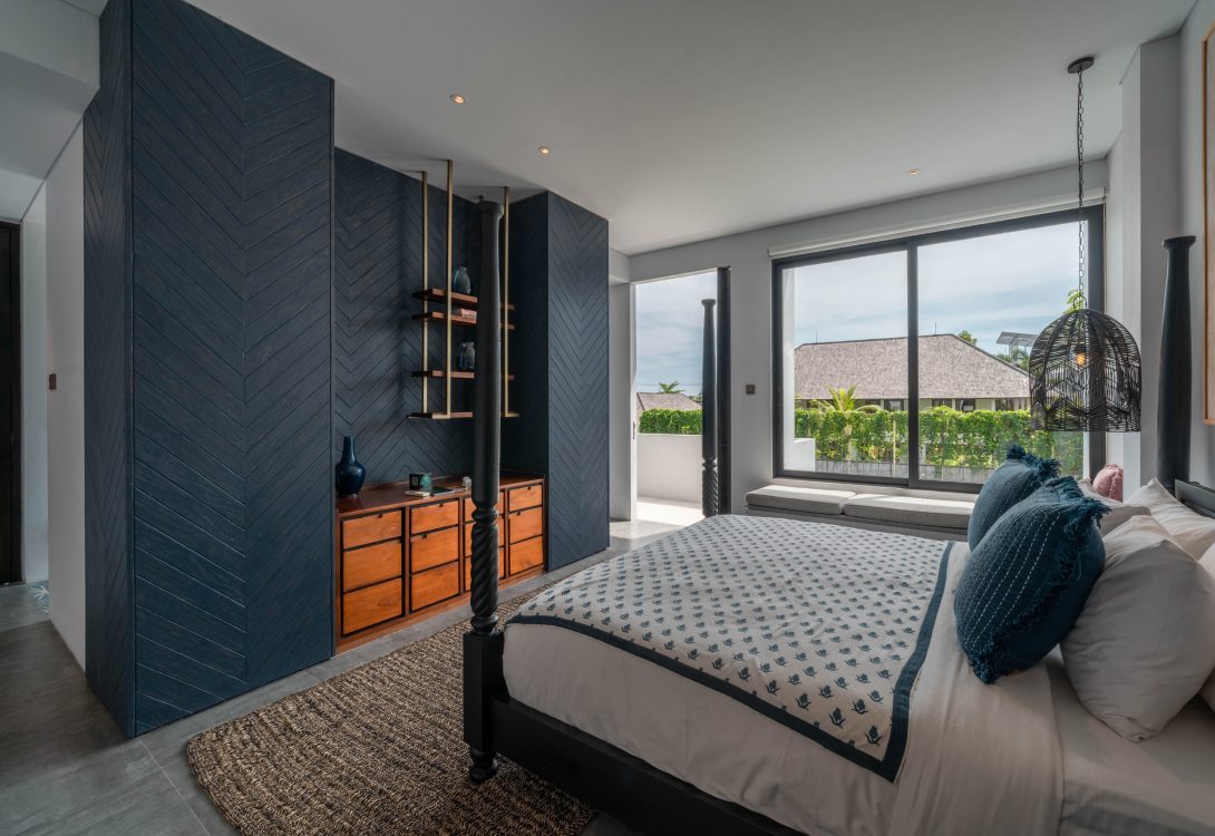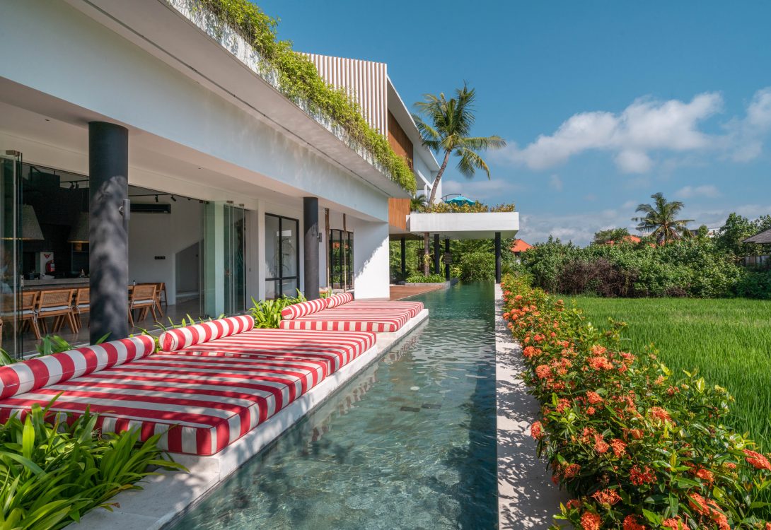 Striking sculptural windows overlook lush greenery and give glimpses into the villa’s sophisticated interiors. Relax in the sunken living area with its soaring ceiling, share meals in elegant indoor or open-air dining spaces, lounge on striped sunbeds, or take a refreshing dip in the pool while gazing out at the rice fields.