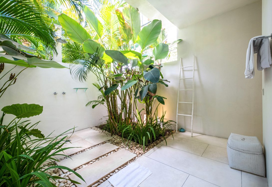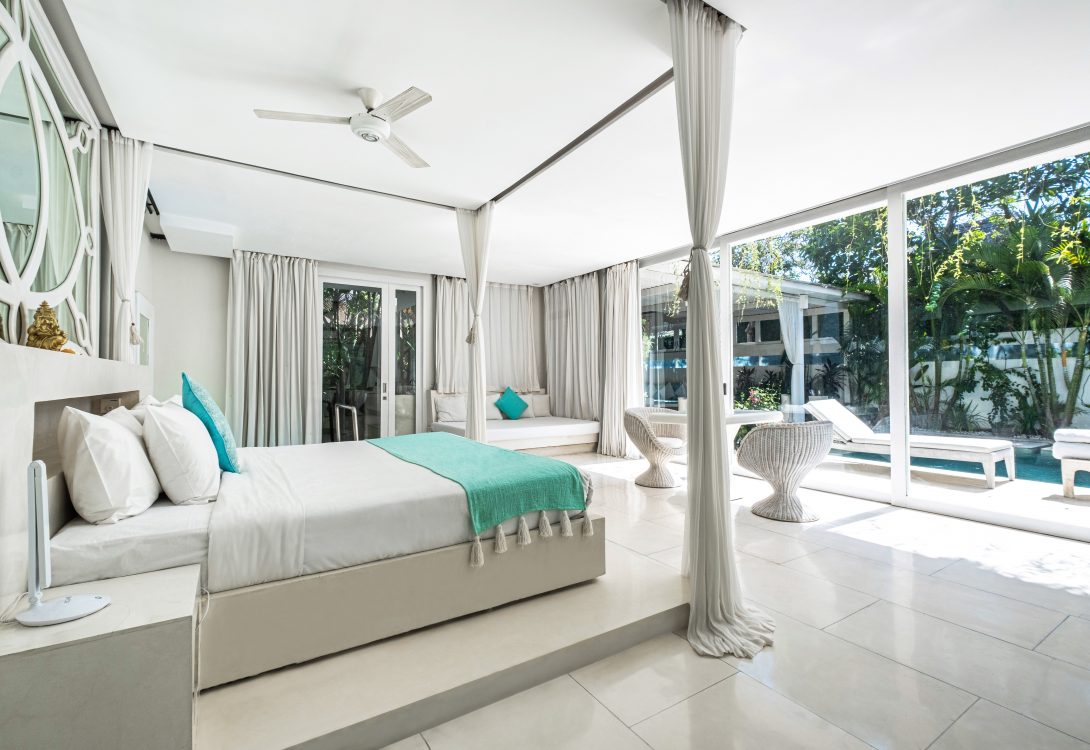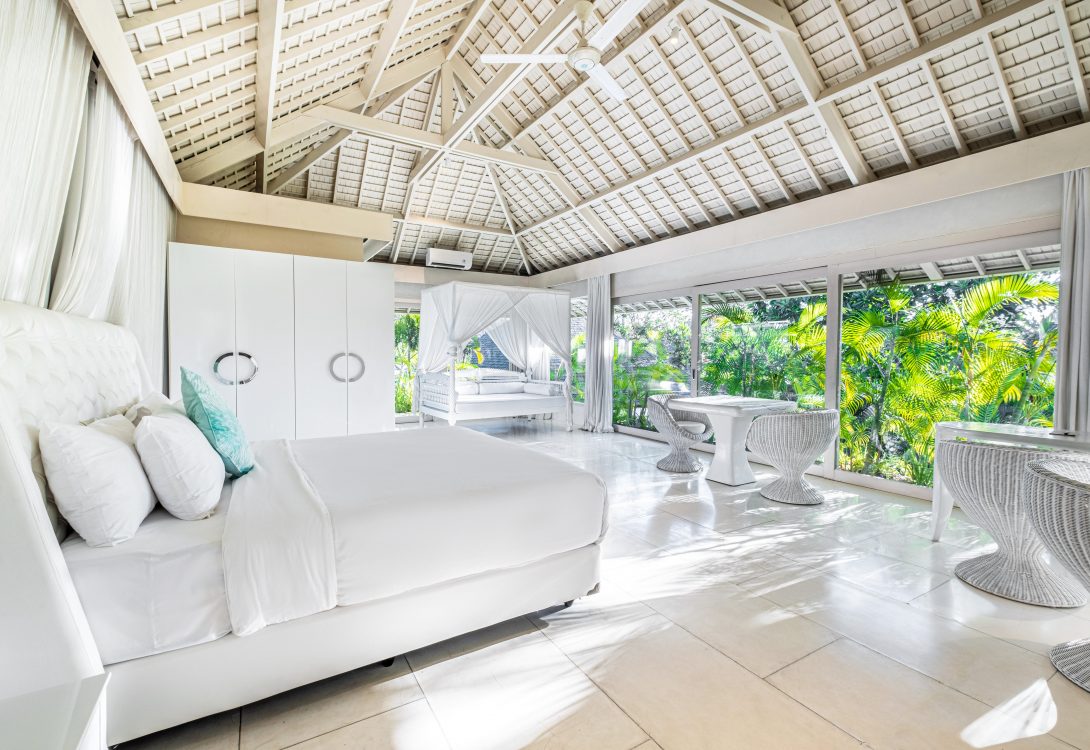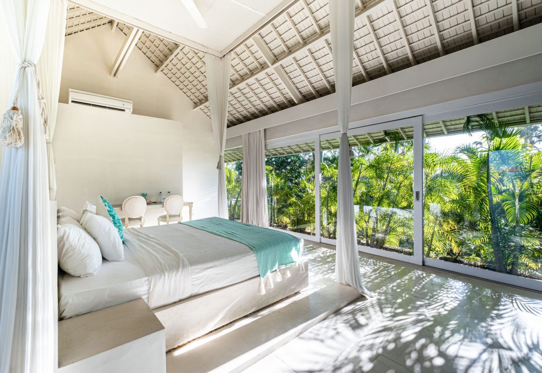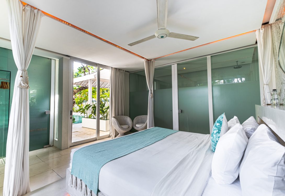 Each air-conditioned bedroom is beautifully styled in white polished concrete with king-size beds, walk-in closets, and ceiling fans within soft canopy nets. The three ground-floor rooms open directly to the garden and feature indoor-outdoor bathrooms with rain showers and sunken bathtubs surrounded by lush greenery. The two master suites upstairs offer vaulted ceilings, daybeds, and stunning pool views — plus a private outdoor lounge with a large built-in sofa, perfect for sunset relaxation.