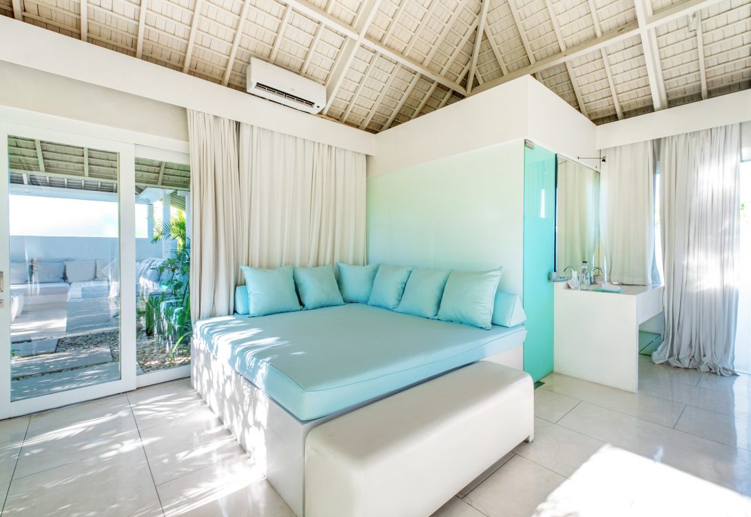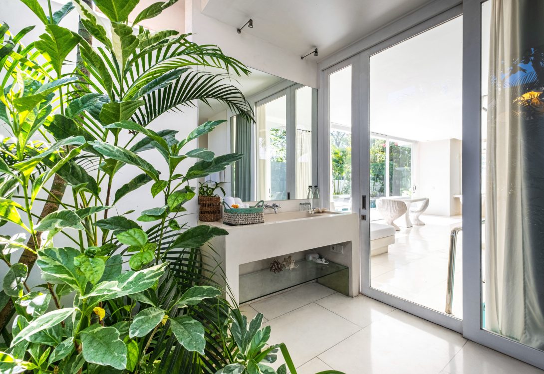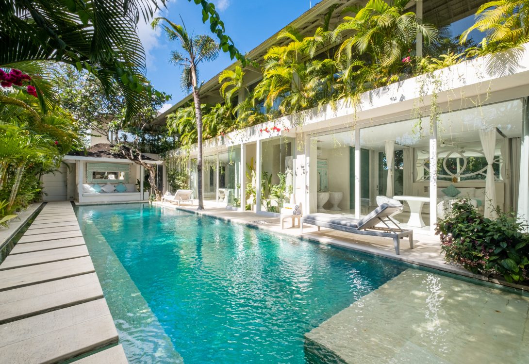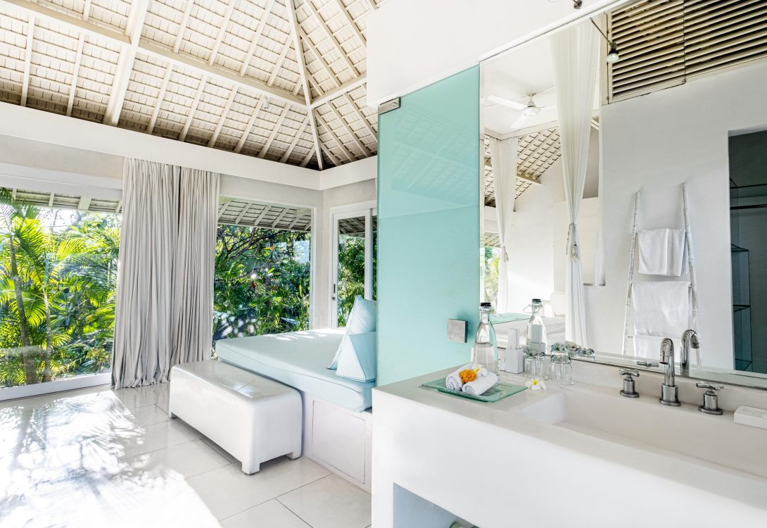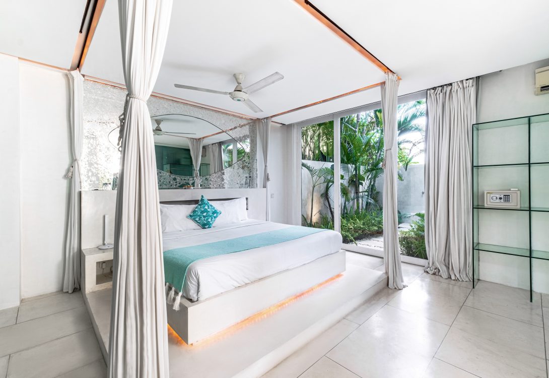 Each air-conditioned bedroom is beautifully styled in white polished concrete with king-size beds, walk-in closets, and ceiling fans within soft canopy nets. The three ground-floor rooms open directly to the garden and feature indoor-outdoor bathrooms with rain showers and sunken bathtubs surrounded by lush greenery. The two master suites upstairs offer vaulted ceilings, daybeds, and stunning pool views — plus a private outdoor lounge with a large built-in sofa, perfect for sunset relaxation.