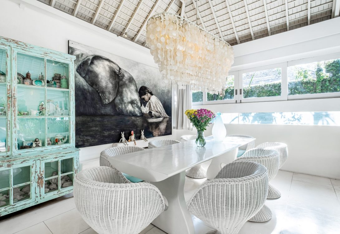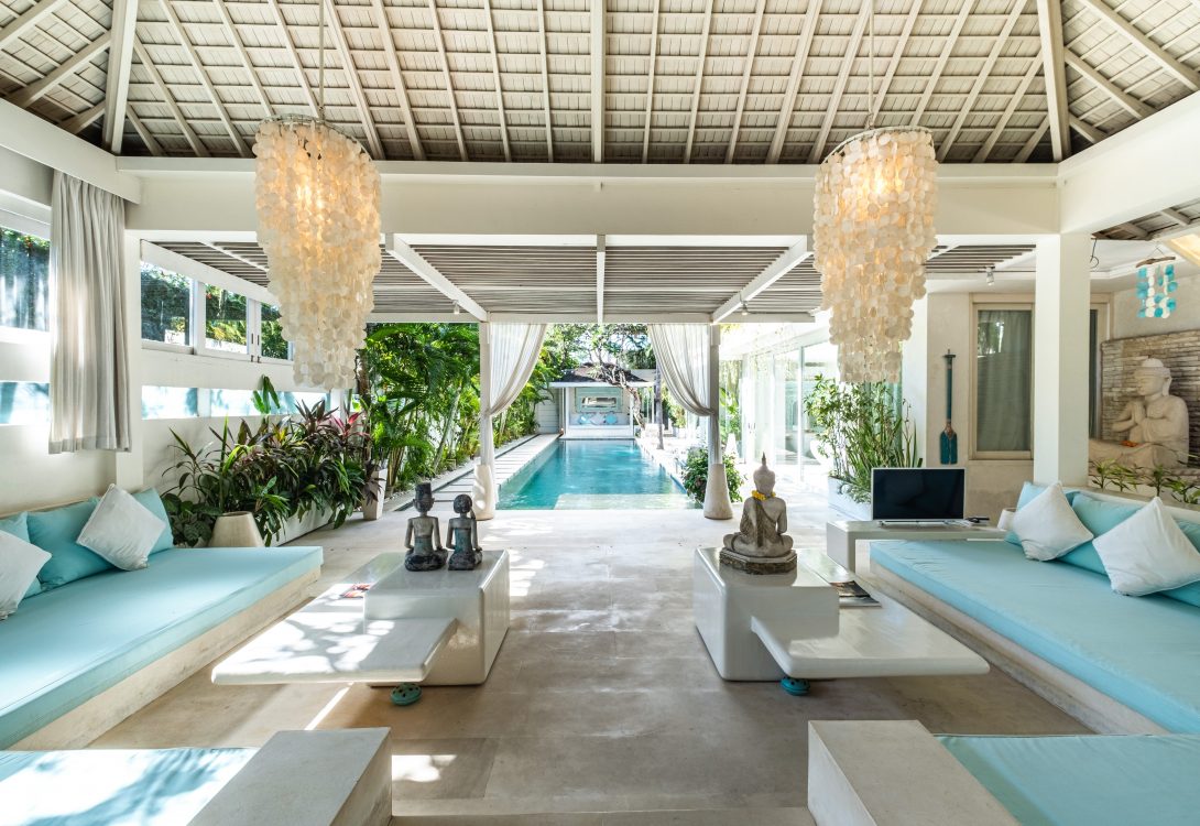 The open-air living and dining pavilion blends modern design with tropical charm, featuring high ceilings, capiz-shell chandeliers, and plush sofas with aqua accents. Enjoy meals at the elegant dining table or gather by the pool deck surrounded by palms and frangipani trees. With a private TV area, sound system, and sun loungers, this villa is a perfect retreat for those seeking luxury, privacy, and Bali’s laid-back beauty.